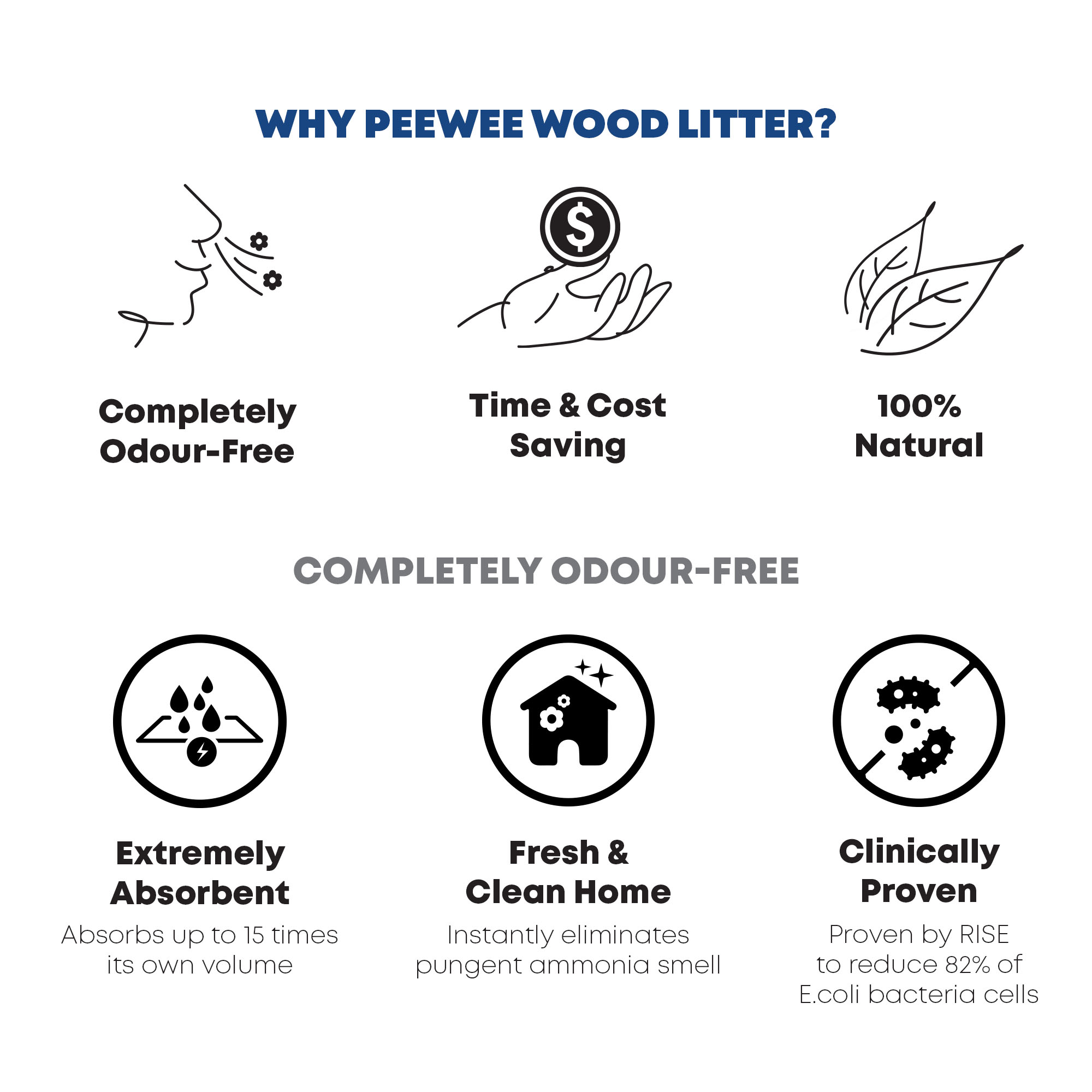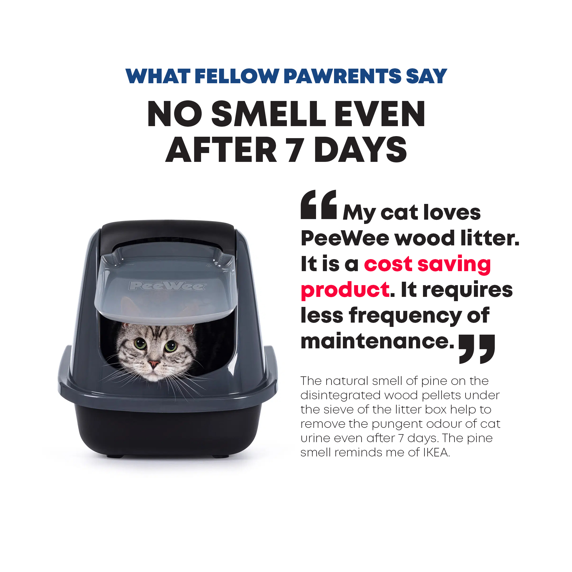 The PeeWee Eco Wood Litter 9kg is specially designed for cats. The wood shavings and pellets don't stick to paws; that's better for your cat and rids your home of soiled cat litter dust! PeeWee wood pellets have the unique characteristic of neutralising the smell of ammonia and absorbing considerably more moisture than any other cat litter on the market − up to 15 times their own volume! One bag of pellets can last for 3-4 months in a single cat household when used with PeeWee litter boxes.