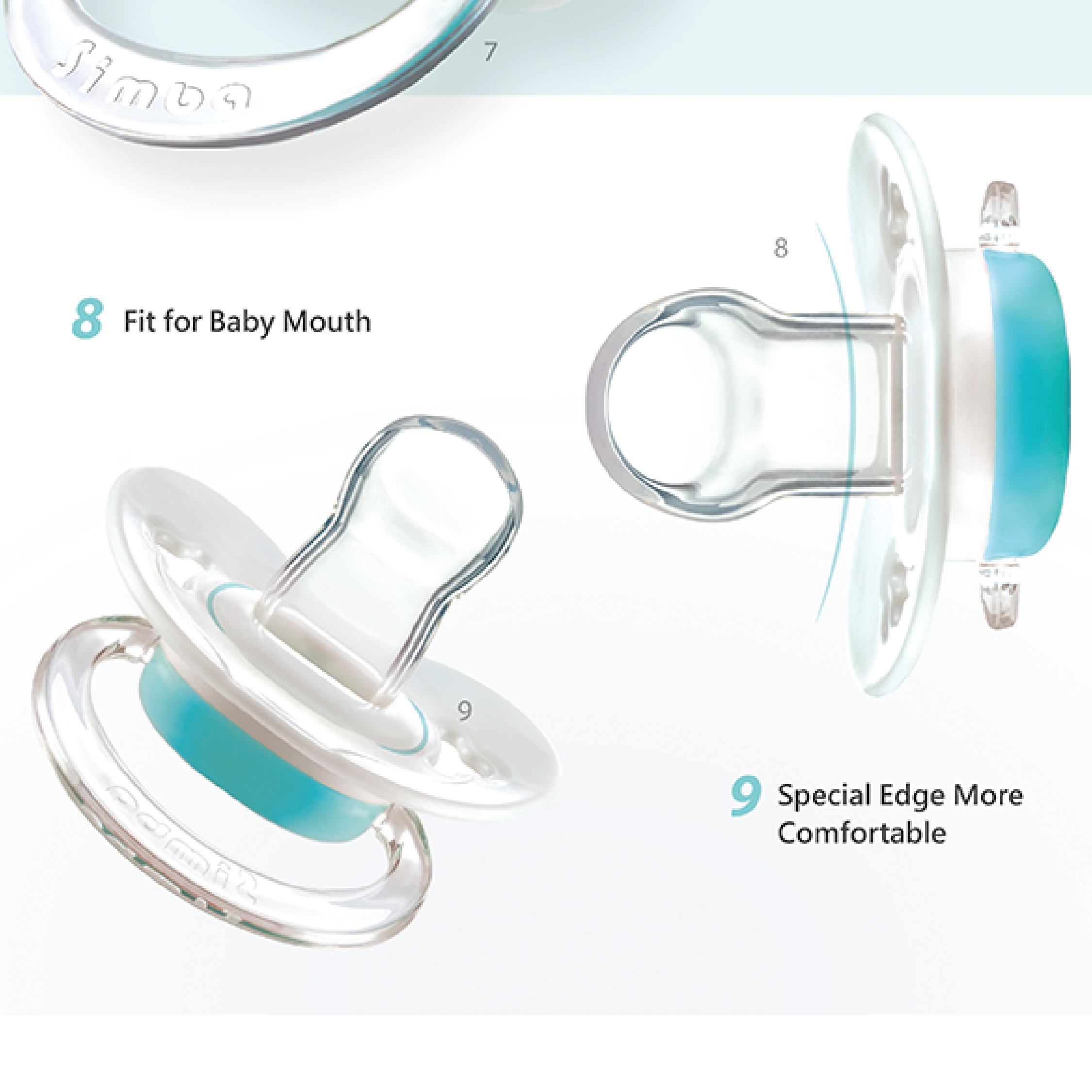 ●Thumb Shaped: Suitable for the shape of baby’s jaw and teeth. Groove design prevents saliva adhesion between lips and pacifier.