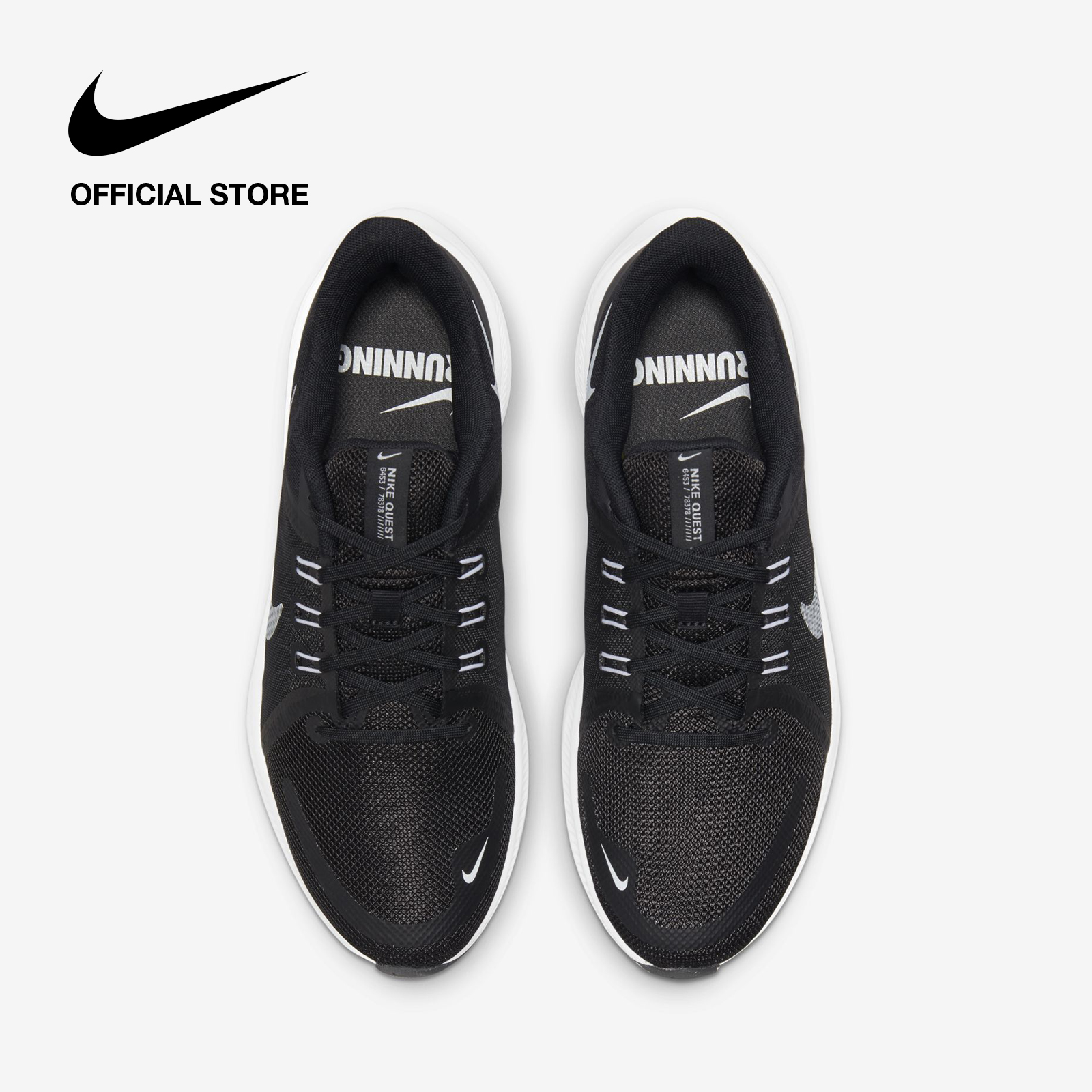 The mesh-lined tongue is connected to the upper's inner lining for a secure feel. An alphanumeric logo at the tongue spells out Nike Quest.