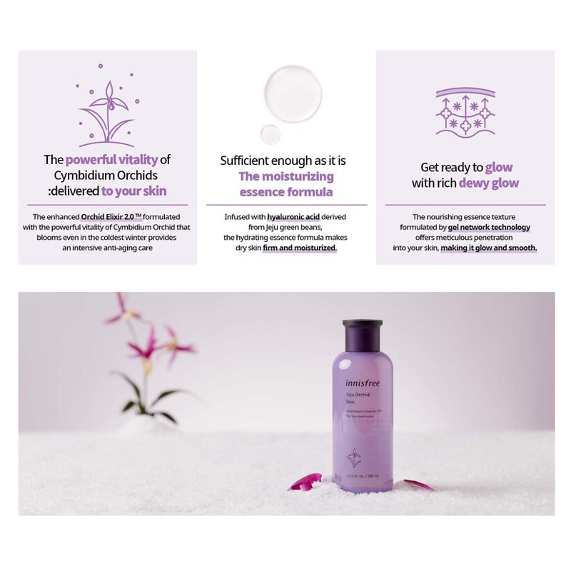Volume / Weight 200ml / 232gIdeal for for all skin typeExpiration Date 36 monthsHow to Use Apply over face and neck after cleansing, then gently pat for better absorption.Manufacturer / Distributor Cosvision Co., Ltd. / innisfree CorporationCountry of Manufacture South KoreaIngredients WATER / AQUA / EAU, BUTYLENE GLYCOL, GLYCERIN, ALCOHOL, NIACINAMIDE, GLYCERETH-26, GLYCERYL POLYMETHACRYLATE, DIMETHICONE, PPG-13-DECYLTETRADECETH-24, PROPANEDIOL, AMMONIUM ACRYLOYLDIMETHYLTAURATE/VP COPOLYMER, GLYCERYL CAPRYLATE, ACRYLATES/C10-30 ALKYL ACRYLATE CROSSPOLYMER, HYDROGENATED LECITHIN, FRAGRANCE / PARFUM, ETHYLHEXYLGLYCERIN, ADENOSINE, POTASSIUM HYDROXIDE, DISODIUM EDTA, HYALURONIC ACID, SODIUM METHYL STEAROYL TAURATE, BETAINE, GLUCOSE, ORCHID EXTRACT, ACETIC ACID, TOCOPHEROL MFDS Evaluation of Functional Cosmetics YCautions for Use (1) For external use only. (2) Avoid direct contact with eyes. (3) If contact occurs rinse thoroughly with water. (4) Discontinue use and consult a doctor if irritation occurs. (5) Keep out of reach of children. Quality Assurance Standard Compensation for defective products is provided according to the criteria notified by the Fair Trade Commission. |