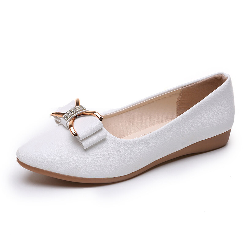 Atikota Women Fashion New Flat Shoes Shallow Mouth Bow Rhinestone Peas Shoes Solid Color PU Single Shoes