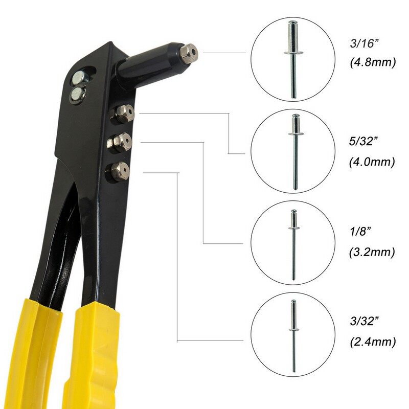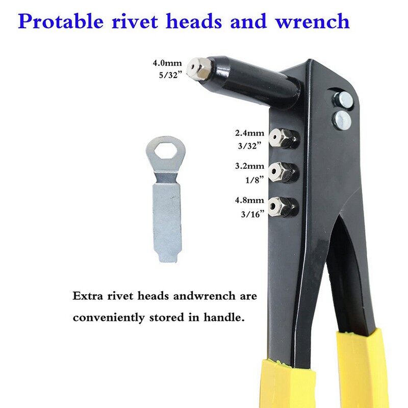 This set includes one tacklife hand riveter comes with, wrench store in handle and four mounted nosepieces, in 3/32"(2.4mm), 1/8"(3.2mm), 5/32"(4.0mm) and 3/16"(4.8mm). Also have two size of aluminum dome blind rivets: 3.2*10mm and 4.0*13.5mm.