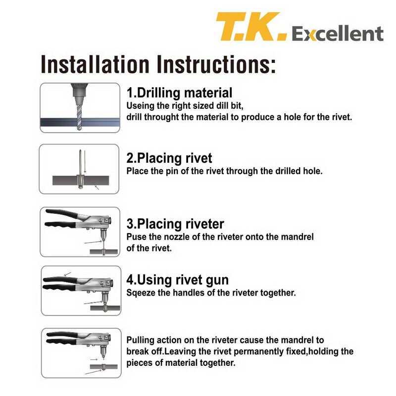 You have everything you need to start using this remarkable tool immediately. Can handle just about any of the most common sizes of plastic and metal for sturdy, reliable rivet fasteners. Blind rivets can be used for different purposes at home and workplace. These fasteners attach metal sheets together so easily and effectively. The rivet body is made of aluminum, which length 235mm. Assembly applications include office furniture, mobile homes, public transportation, plastic components, electrical engineering, and lighting. Specially designed tool is used to draw the mandrel into the rivet. Used to secure two or more components together.