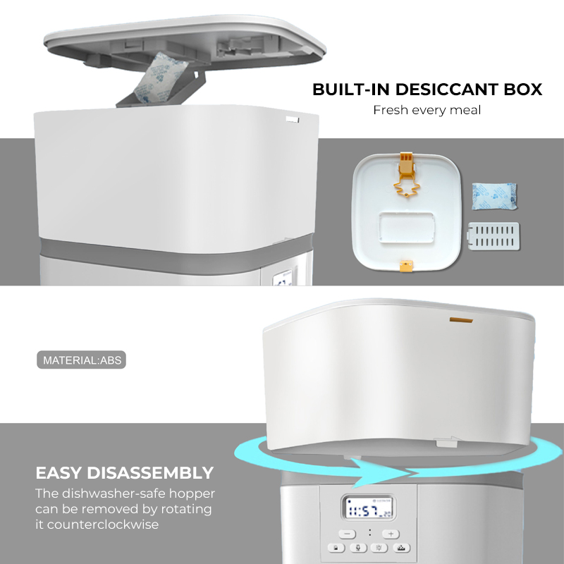 Our pet feeder's integrated desiccant box ensures your pet's food quality remains uncompromised. No need to fret about moisture issues anymore. The desiccant box efficiently absorbs excess moisture, preserving the food's freshness and safeguarding it from mold or bacteria. Give your pet the assurance of a delectable and nourishing meal every time.