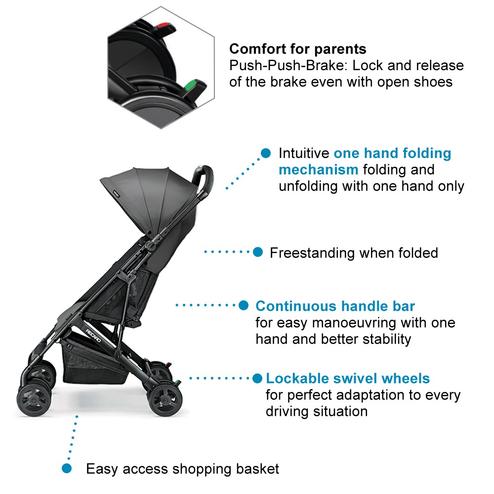 •Stroller is suitable from approximately 6 months above up to 15 kg, approximately 3 years of age •Intuitive one-hand folding mechanism •One of the lightest pushchairs in its class, weighing just 5.7kg •3 layers of sun canopy with UPF 50 and water repellent •5-point seat harness to keep passenger safe and secure •Freestanding when folded •8 smooth, sturdy wheels complete with all-round suspension •Continuous handle and front swivel lockable wheels for easy manoeuvring with only one hand •Removable lockable 360-degree swivelling wheels •Push-Push-Brake: Lock and release of the brake even with open shoes •Backrest is adjustable and can be recline in multiple positions for snoozing or sitting up •Mesh parent peekaboo window offers visibility and ventilation – with integrated magnet for a more comfortable handling of the window flap Meshed fabrics on backrest for more temperature-balancing comfort •Foam material for better seating comfort for the kid •Under-seat shopping basket for groceries and other bags •Compatible with Recaro Car Seat for travel system use