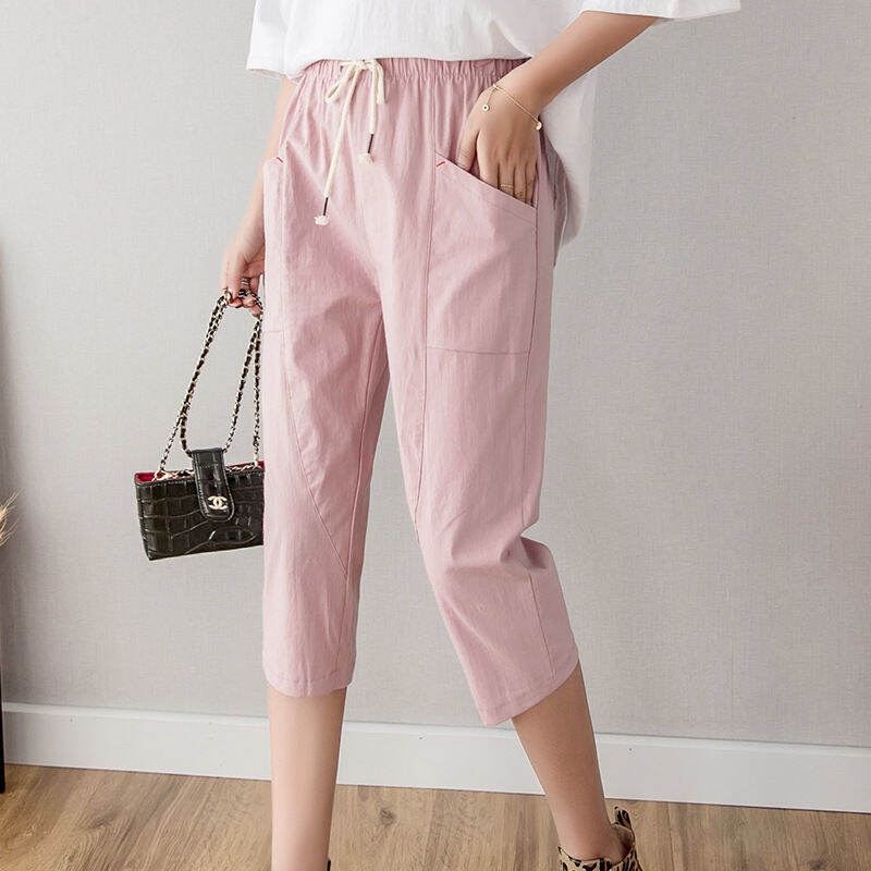 Summer Women's Cotton Linen Harem Pants Loose Student Capri Pants Casual Women's Pants Young Adult Solid Color Pocket Thin Baggy Pants