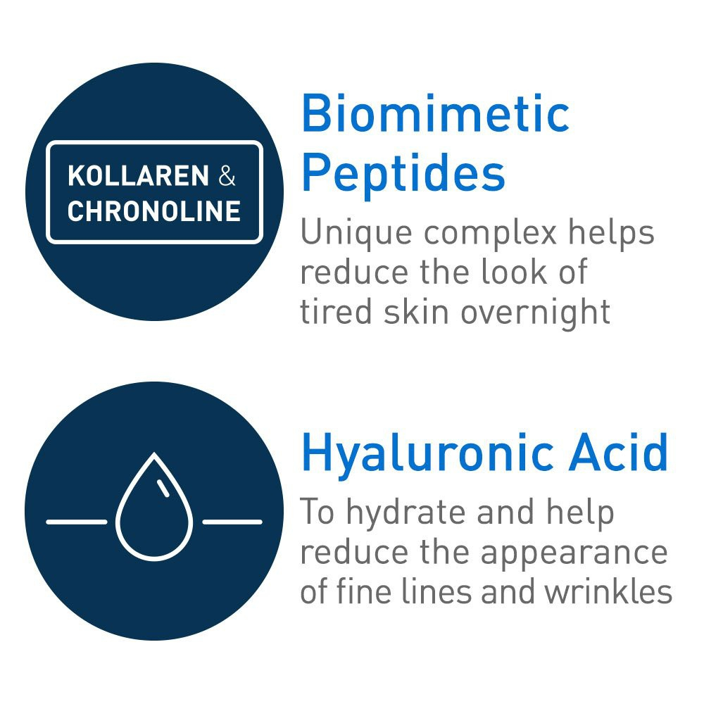 Nighttime is the skin’s chance to repair and renew itself, and a properly formulated night cream provides hydrating and rejuvenating ingredients. We recommend looking for moisture-rich hyaluronic acid, calming niacinamide and barrier-replenishing ceramides like our CeraVe Skin Renewing Night Cream, which also features peptides to help improve the appearance of fatigued skin overnight. -Reduces the appearance of fine lines and wrinkles -Provides intense hydration -MVE Technology: This patented delivery system continually releases moisturizing ingredients for 24-hour hydration -Biomimetic peptides: Improve the appearance of tired-looking skin -Ceramides: Essential for healthy skin, ceramides help restore and maintain the skin’s natural barrier -Hyaluronic acid: This ingredient attracts hydration to the skin’s surface and helps the skin retain moisture -Niacinamide: Helps a compromised skin barrier while improving the appearance of the skin -Non-comedogenic, non-irritating and fragrance-free -Developed with dermatologists Ideal for all skin types, CeraVe Skin Renewing Night Cream features an exclusive complex of biomimetic peptides that work to refresh tired-looking skin, hyaluronic acid to help the skin retain moisture and three essential ceramides that restore and reinforce the skin’s barrier while you sleep. This non-greasy, intensely moisturizing skin renewing night cream is designed to improve the appearance of fine lines and wrinkles, and patented MVE Delivery Technology provides the skin with 24-hour nourishment—so you can wake up looking rested and rejuvenated.
