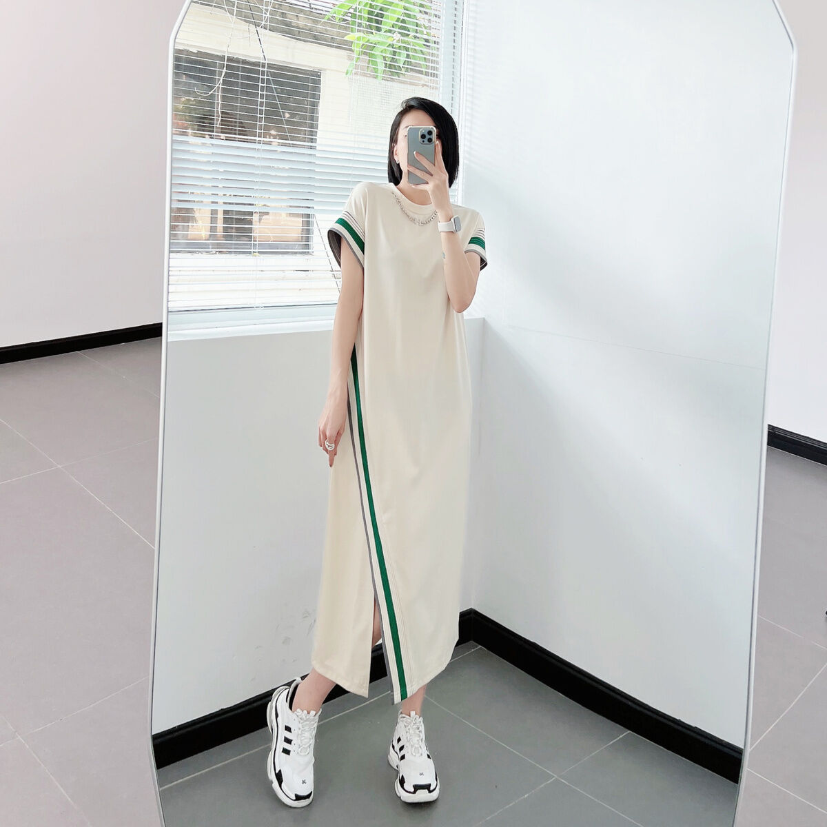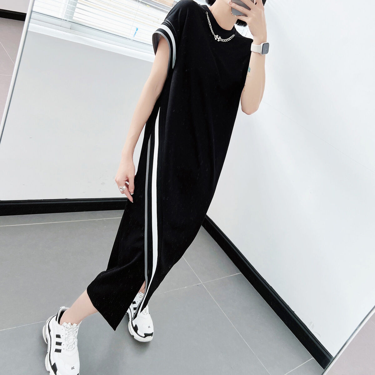 Summer Plus size women clothing Fat mm 1.00 Kg-150.00 kg Shoulder Dress Short sleeve Loose Slimming Belly Covering over the Knee Long Skirt