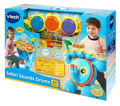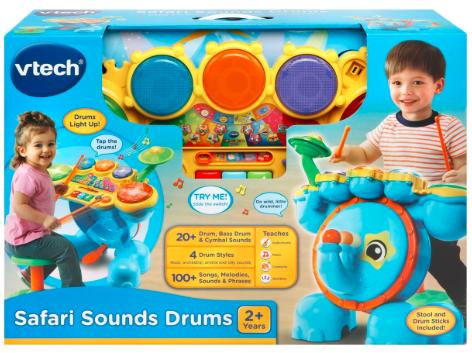 Get ready to rock with the Safari Sound Drums ™ by VTech®. Encourage your little one to be a star while they enhance creative thinking and motor skills by tapping out beats and creating their own sounds using the included drumsticks! They will enjoy this fresh way to practice counting and develop coordination while following along with the melodies and sing-along songs! Four game modes let your child tap the drums to learn counting, catch the lights, follow the leader or create their own composition. Your mini musician will love sitting on the stool and stepping on the elephant bass pedal to see the elephant trunk move up and down and create a fun bass sound effect. Watch them jam out to the beat of their own drum and create some sweet rockin' tunes!