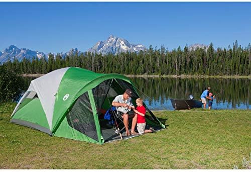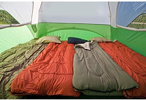 polyester taffeta 75D Made in the USA or Imported Measures 14 x 10 feet with 5-foot 8-inch center height Spacious tent has enough room for 6 people with 2 queen size airbeds Sets up in 15 minutes with rainfly and carry bag included Snag-free continuous pole sleeves with insta-clip attachments to stand up to winds WeatherTec System features patented welded floors and protected seams to keep you dry, angled rainfly lets in light but not water