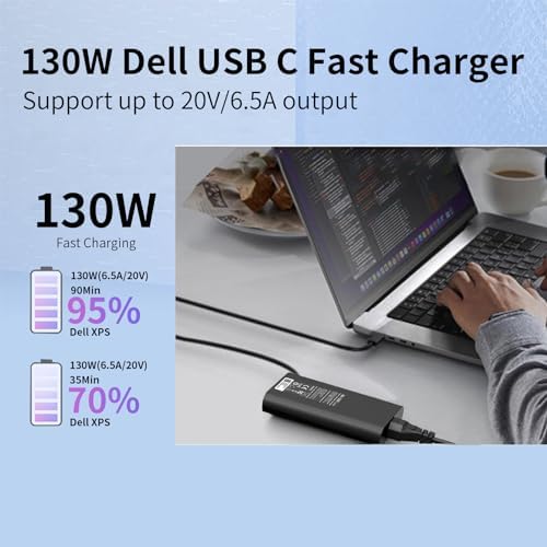 SPECIFICATION: Input Voltage: 100-240V~1.5A,50-60Hz; Output:5V/9V/15V/20V - 1A/6.5A , MAX Power 130W(Compatible with 90W 65W DELL Laptop Charger USB C); Connector Tip:USB Type-C / USB-C. PLEASE CONFIRM THE SPECIFICATIONS OF YOUR DELL POWER ADAPTER BEFORE ORDERING. COMPATIBLE P/N: Dell 130W USB C Charger fits for T4V18 0K00F5 K00F5 M0H25 M0H25 7MP1P 450-AHOM DA130PM170 HA130PM170 0TDK33 0Y2XGV Computer charger Dell 130W AC Adapter replacement Dell XPS 15 9575 2-in-1 4K Touch-Screen Laptop Model: XPS9575-7354BLK-PUS. COMPATIBILITY: Dell 130w laptop charger USB C fits for Dell XPS 15 9575 2-in-1 XPS 15 9500 17 9700 . Dell USB C charger fits for Dell Latitude 7410 7310 7210 9410 5420 5520 5320 5411 5510 5511 5310 5410. Fits for Dell Precision 5550 5750 3560 3550 3551,Precision 3540,Precision 5530 2 in 1 laptop charger. Dell XPS 15 charger TOTAL PROTECTION: Dell usb c laptop charger built-in security system provides safe and protected charging, allowing you to power your device with confidence. 130w Dell laptop charger USB C, it is the best choice for your backup charger. PACKAGE: 1*130w Dell AC adapter, 1*Dell laptop power cord.