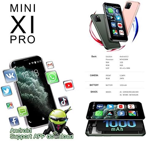COOL MiNi SMART PHONE with such a Cute iPhone 11 Pro Max Look alike Design and a Mini 2.5 inch Little TouchScreen. Use it like any other Android mobile, You Can Browse the Internet anywhere and use Google Play Store to Download apps at the Palm of your Hand. THIS PHONE IS UNLOCKED it will be compatible with all 2G and 3G network in US. This may include Cricket, Straight Talk, NET10, MetroPCS, Simple Mobile, Google Project Fi, T-mobile, VERIZON, AT&T and more. Check Your Network Compatibility FOR 3G WCDMA 850/2100MHz , 2G GSM 850/900/1800/1900MHz. TINY DEVICE, MANY FEATURES! With Bluetooth, Wi-Fi and SIM Connectivity The little Smart Phone supports Voice Calling, Video Calls, Camera, Sound Record, Email, MP3 Playback, GPRS, FM Radio, Touchscreen, GPS Navigation, Message, SMS, MMS, Video Player, Memory Card Slots,Internet Browser. Use The GOOGLE PLAY STORE & Download your Favorite Apps: Facebook, Youtube, Twitter, Whatsapp, Chrome, Waze, Instagram and many more... FAST STRONG AND DURABLE With MTK Quad CPU, 1GB Of RAM, 8GB of Storage. Strong durable body With a Great but Small iPhone 11pro / XI Pro Max Design! CONNECT ANYWHERE GLOBAL UNLOCKED with Wifi, Bluetooth and GPS Navigation You can Connect anywhere Enjoy a Simple life With a Small portable SmartPhone. Check Your Network Band for GSM or WCDMA. Do Not Buy Before Checking Band Compatibility! USE IT LIKE ANY OTHER ANDROID SMARTPHONE !!! Download your Apps via The Google Play Store. Smart & Small. Children Just Love It!!! BEST BACKUP PHONE, POCKET SMARTPHONE - Improved 1000mAh Battery!!! Awesome Nice Gift! Portable and Great for Travel!!! Dual Camera: front (with Beautifying), Rear Back . Dual Sim dual standby. MINI CUTE PHONE. Super small just like a bank card. Mini iPhone 11 Pro Look's and Feeling! XI Pro / Pro Max.