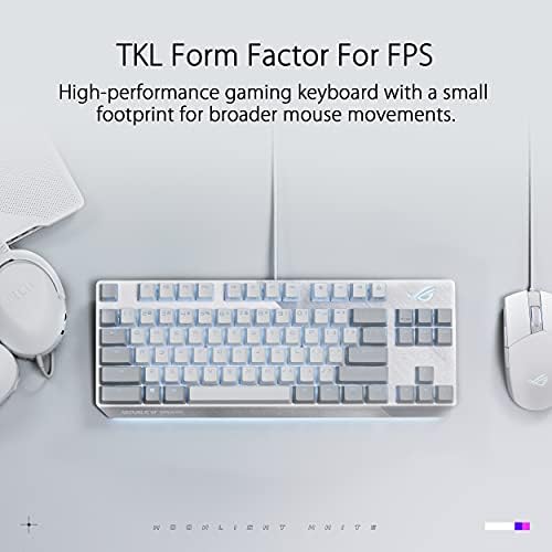 READY FOR ACTION, COMPACTLY CRAFTED - The ROG Strix Scope NX TKL Moonlight White is a compact, tenkeyless mechanical keyboard, featuring Xccurate Design – an extra-wide Ctrl key that's easier to feel and find in a frenzied FPS session. TKL FORM FACTOR FOR FPS - A high-performance mechanical gaming keyboard with a small footprint, freeing up space on your worktop for broader mouse movements – perfect for lower-sensitivity settings that slow the reticle for leveled-up aiming accuracy. The keyboard is topped with an aluminum faceplate for everyday resilience and it’s finished with a striking slash aesthetic to add a touch of style. ROG NX MECHANICAL SWITCH - Exclusive ROG NX mechanical switches offer fast actuation and specially tuned force curves for great keystroke feel & feedback. ROG NX Red mechanical switches provide a 1.8 mm actuation point for fast input. An initial actuation of 40 gram-force (gf) helps prevent accidental keystrokes, and it extends to 55 gf for perfect rebound feedback. As a result, keystrokes are instantaneous and have a smooth and linear feel. DYNAMIC RGB LIGHTING - Enjoy vibrant RGB illumination with the ROG Strix Scope NX TKL Moonlight White. Featuring individually illuminated keys, lock indictors and ROG logo, plus an arresting RGB underglow effect that extends the lighting beyond the keyboard. Powered by Aura Sync, the entire color spectrum and a range of dynamic lighting effects at your command is uniquely yours. MINIMALIST LOOK, MAXIMUM IMPACT - The new Moonlight White product series offers a range of new devices with a clean aesthetic. Arm yourself with the Moonlight White editions of the ROG Strix Scope NX TKL keyboard, Strix Impact II optical-sensor mouse, Strix Go Core headset, Cetra II Core in-ear headphones, and the Zephyrus G14 and G15 gaming laptops.