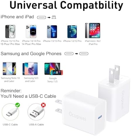 【20W High-Speed Power】: Ocupwei Fast Charger Block equipped with 20W PD 3.0 USB Type C power delivery wall plug, PD 3.0 Quick-Charge USB C port provides Max 20W output power, charging your Phone from 0-50% in only 30 minutes, and other compatible devices at optimal speeds, saving time for you. 【Universal Compatibility】: No more trigger warning messages. Ocupwei USB C Charger Block is optimized to work flawlessly with all your mobile devices including Phone 15/15 Pro/15 Pro Max/15 Plus/14/14 Pro/14 Pro Max/14 Plus/ 13 / 13 Mini / 13 Pro / 13 Pro Max / 12 / 12 Mini / 12 Pro / 12 Pro Max, Phone SE, Phone 11 / 11 Pro / 11 Pro Max, Phone XS / XS Max / XR / X, iPad Pro 12.9 / 11 / Pad Air 3 / Pad Mini(2019), Google Pixel 7/ 6/ 5/ 4 / 4 XL / 3 / 3 XL / 2 / 2 XL, Galaxy S23/ S22/ S21/ S20/ S10 / S10+ / S10e / S9 / S9+ / S8 / S8+ / Note 10 or other devices that support USB Power Delivery. 【Safety Protection】:Suitable for the U.S. and the World electrical standards. Ocupwei Type C Wall Charger has ETL(US),FCC,CE,ROHS certification. The certified Charger Cube has an output power of 5v1a/ 5v2a/ 5v3a/ or 9v1a/ 9v2.2a. The charger is controlled by AI chip and matches the output power intelligently according to the power required by your device, ensuring safety and battery protection while quickly charging your device. 【Compact & Lightweight】: Extremely compact size & travel-friendly design, Ocupwei Compact USB-C Charging Brick sits flat to the wall to fit easily behind furniture or in hard-to-reach outlets. It's also perfectly-sized to fit in a pocket or bag. Efficient charging at home, in the office, or on the go. 【What You Get】: Ocupwei 20W USB C Power Delivery Charger Block - 2PACK. Worry-free 12-month warranty and 24/7 customer service, life time technical support.