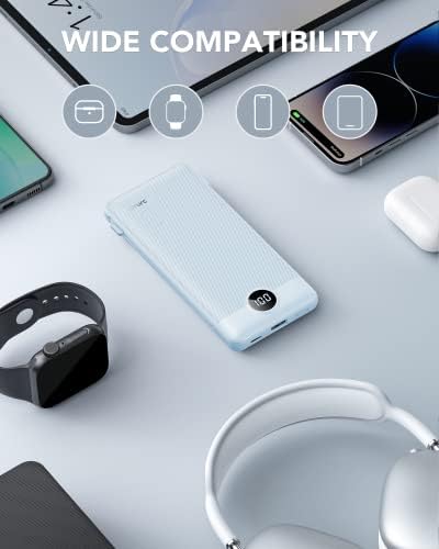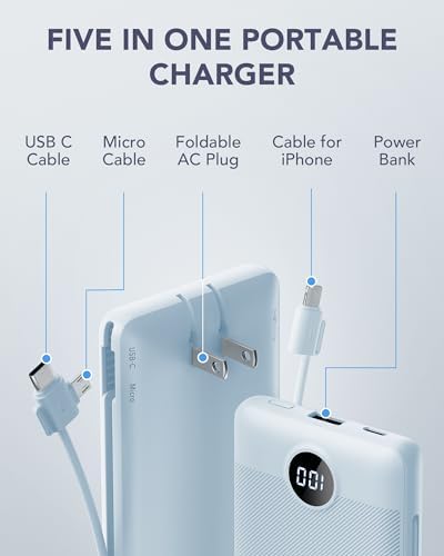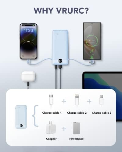 VRURC Portable Charger Built-in Cables and AC Wall Plug, USB C Power Bank 10000mAh, [2023 Upgraded Version] Phone Charger Compact Lightweight External Battery Pack for Smart Phones, Tablets etc-Blue