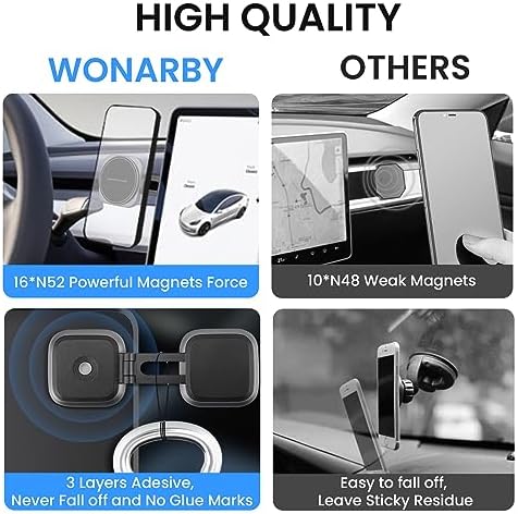 Powerful Magnetic Force : Upgrade the Built-in Ring Magnets Array with 16 ultra-powerful N52 magnets provides strong magnetic suction power, better corrosion resistance and more excellent magnetic performance. Even on rough roads, tesla magnetic phone mount can create a powerful attraction that firmly supports your device. Strongest Adhesion: Upgrade high-quality 3M adhesive for Tesla Model 3/X/Y/S Accessories Phone Mount, which is super sticky and long-lasting. So even in extreme environments, it will not fall off. The 3M adhesive on the base will not leave glue marks when removing it. Designed for Tesla Model 3/X/Y/S: This cell phone mount for car is designed for Tesla central touch screen. With the foldable design, you can hide it on the back of the central screen. It also can be mounted on the dashboard or windshile. Angle & Length Adjustable - The tesla phone holder is 360 degrees rotatable and the length of the premium metal arm can be extended 1.51 inches, allowing you to easily rotate your phone and adjust it to the perfect viewing angle for you. Work for All Phones: For phones without magsafe function, we provide an extra 2 metal rings, all you need to do is stick the metal ring on the back of your phone or case, so you can also enjoy a magsafe experience. For iphone 14, 13 and 12 series with magsafe function, the Tesla magnetic phone mount can be used directly. We provide 2 metal rings, user manual and extra 3M adhesive.( And we suggest you to wait it for 24 hours to use it after installation.)