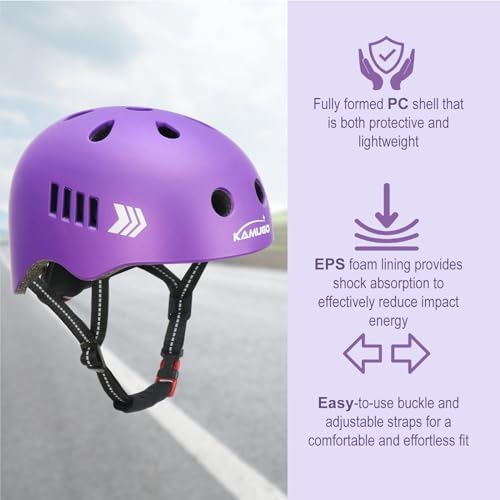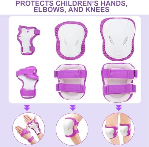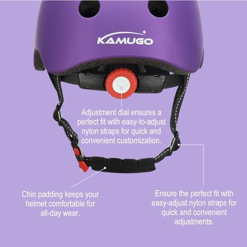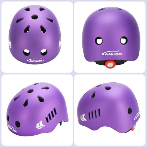 PREMIUM SAFETY: KAMUGO kids helmets set are specially designed for kids head protection, complies with US CPSC Safety Standards,Child helmets are made with tough and durable Polycarbonate shell and high quality Expanded Polystyrene foam integrated molding,Toddler helmet have reflective markings on both sides and back, making exercise safer for children. LIGHTWEIGHT ADJUSTABLE HELMT: Kids bike helmet only weighs 280g, Children helmets have adjustable crank adjustment dial and strap ,and changing the length of the chin strap, maximize the best fit and comfortable wearing, perfectly for boys and girls 2-8 years old. Toddler helmet size: 19.3'-21.3',one kids helmet set can be used for a few years. VENTED & COMFORTABLE: 19 air vent let air go through the kids helmet,Toddler skateboard helmet set can keep their heads cool even. Kids scooter helmet internal protective padding is soft, detachable and washable.Kids adjustable helmet with soft and comfortable chin pad, no more worries about that the straps may scratch child's sensitive skin. SUITABLE FOR MULTI-SPORTS’S GIFTS: Toddlers helmet gear set suitable for cycling,biking,skateboard, scooter, inline, ice rolling,ice skating etc multi-sports.Toddler helmets set are excellent gifts for boys and girls aged 2 to 8, Kids helmet set also a perfect gift for holidays such as birthdays, Thanksgiving, and Christmas. SATISFYING AFTER-SALES SERVICE: We are trying our best to provide the best customer service and bring the best shopping experience to every customer. If you are not satisfied with helmet gear set for kids, please contact us any time and We will assist you in resolving all issues until you are satisfied.