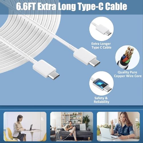 ✅【Safety Super Fast Charger USB-C】25W USB-C PD 3.0 Technology provides Max 25W output power for all Galaxy S24/S23/S22/S21/S20/Ultra/Plus/FE/Z Fold/Z Flip/Note 20/Note 10/Galaxy Tab A7/A8/S7/S8/S9,Fast Charge Your battery from zero up to 100% in about 60 min,5 times as fast as Standard Charger Block,10 times as fast as PC USB port and saves you time. ✅【Safeguard Protection】Match safety standard to advoid over-load, short current and overheat.Continuous high-power output will have a temperature rise, but they are all within the safety limits of standard certification. ✅【Super Fast Charger Compatibility】The USB C fast wall charger cable kit supports most of most of USB C devices, including Galaxy S24,S24+,S24 Ultra,S23,S23+,S23 Ultra,S23 FE,S22,S22+,S22 Ultra,S21,S21 Ultra,S21+,S21 FE,S20,S20+,S20 Ultra,S20 FE,Z Fold 2/3/4/5,Z Flip 2/3/4/5,S10,S10e,S10 Plus,S9,S9+,S8,S8+,Note 10,Note 10+,Note 20,Note 20 UltraA54,A53,A52,A51,A50,A13,A14,Google Pixel,Pixel 2,Pixel 3,Pixel 4,Pixel 5L,Pixel 6,Pixel 7,Pixel 8,LG G7 ,LG G8,LG G6,LG G5 and more USB-C devices. ✅【6.6 Ft Type C Charger Cable Cord】6.6 feet extra length USB Type C fast charging cable,designed for fast charging and data transfer, meet different demand in your daily life. it also easy for charging on different occasion, for travel, home, car, office, etc. ✅【Package List】1-Pack PD 25W USB-C Wall Charger Block & 1-Pack 6.6FT USB-C to USB-C Fast Charging Cable.