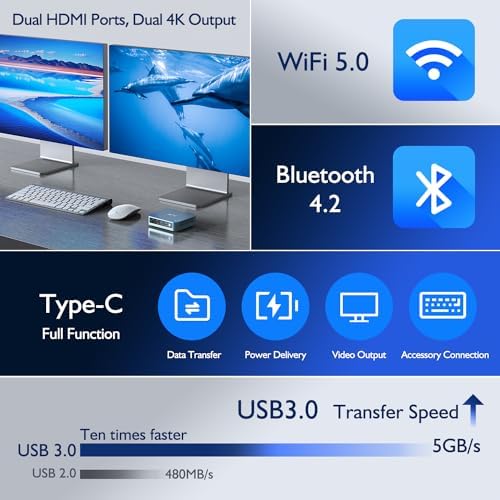 【New 12th Intel N100 Processor】Equipped with the powerful 12th N100 Processor (4C/4T, 6MB Cache, Up to 3.4GHz), released in 2023. It boasts a wide range of external interfaces, including USB3.02, USB2.02, USB-C1, and 3.5mm headphone jack1, making this mini PC an excellent option for your daily work, lightweight design, design work, online education, and more. 【16GB RAM and 512GB SSD】 - This PELADN WI-6 N100 mini PC comes with a pre-installed single-channel 16GB DDR4 RAM (Max 3200MHz) and a 512GB 2280 M.2 SSD. The RAM can be upgraded to a maximum of 32GB, and the storage can be expanded up to 2TB. 【All-in-one Small PC】This mini desktop computer measures only 4.9×4.4×1.4 inches, making it easily portable. It also features a built-in smart cooling fan, ensuring a noise-free experience. With Gigabit Ethernet support, dual-band WiFi (2.4G+5.0G), and Bluetooth 4.2, this machine offers versatile connectivity options. 【Dual 4K UHD Resolution】With the Dual HDMI Ports, you can simultaneously display videos at a resolution of 4096 x 2160@60Hz on two screens. Hang this mini PC on the wall and create your own home theater. 【After-sales Service】 Please feel free to contact us via Amazon message if you have any questions about the product. We will respond within 24 hours. Your support is our motivation to improve our products. This product comes with a one-year warranty.