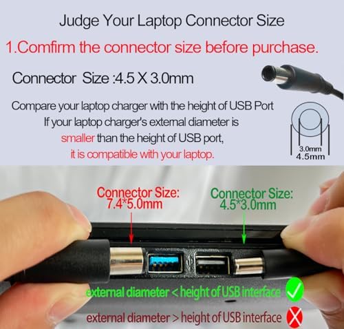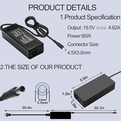?【FOR DELL INSPIRON AC ADAPTER】 Output DC: 19.5V 4.62A 90W (Also Compatible With 19.5V 3.34A 65W/19.5V 2.31 A 45W),AC Input: 100 - 240V 50 - 60Hz, Connector size: 4.5X3.0mm.(Please refer to the picture to comfirm your connector size before purchase). ?【For DELL INSPIRON SERIES】Fit for Dell Inspiron 11 13 14 15 16 17 Series, compatible with Dell Inspiron 11 14 15 17 3000 13 14 15 16 17 5000 13 14 15 7000 Series,fit for Dell Inspiron 13 7000 15 3000 3511 3520(launched in 2022) 5000 7000 laptop charger. ?【For DELL LAPTOP CHARGER 】Compatible with Dell inspiron 13 7000 15 3000 3511 3520(launched in 2022) 5000 7000 17 3000 5000 5770 Latitude 3420 3500 3510 3520 3540 Vostro 14 3400 15 3000 3500 3530 16 5620 ?【PN FOR DELL LAPTOP CHARGER】DA45NM131 DA45NM140 HA45NM140 AA45NM131 HK45NM140 LA45NM121 LA45NM131 LA45NM140 FA45NE1-00 HA65NS5-00 HA65NS-00 LA65NS1-00 LA65NS2-01 DA65NM111-00 LA65NE1-00 FA65NE1-00 PA-1650-02DD PA-1650-05D2 X9RG3 JT9DM 3RG0T 03RG0T CC0DT CDF57 D0KFY 4H6VH 04H6NV MGJN9 JHJX0 492-BBOF 312-1307 332-1827 450-18919 450-1846 450-18920 070VTC 0YTFJC K260C D0KFY X9RG3 JHJX0 0JHJX0 JT9DM CC0DT 03RG0T 04H6NV CDF57 3RG0T 4H6VH P47F P51F P25T P24T P57G 9Q33 0RT74M RT74M PA-1900-32D5. ?【STRICT QUALITY INSPECTION&Warranty】 The upgrade of the chip ensures safe power supply without damaging the battery, effectively protecting electric energy from overcurrent, short circuit, releasing excessive stable voltage, and preventing overcharging.12 Months warranty, 30 days money return guarantee,24 x 7 email support.