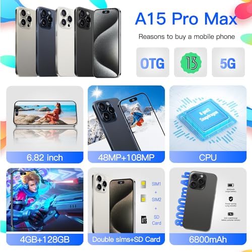 ?【6.82 HD+ for Android 13.0】 Please note that this is an Android phone with a large perforated screen, 2.5D curved edges, and a premium hot-bent glass back cover.5-point capacitive touchscreen. Magnesium-aluminum alloy body. Face recognition, in-screen fake fingerprint unlock, can better protect your privacy. With WIFI+BT+FM+GPS, Type-C charging port, Type-C standard headphone jack, new upgrade. ?【Long-lasting Battery Capacity】Professional unlocked phone with up to 6800mAh battery capacity.Equipped with 50 megapixel front camera and 108 megapixel rear camera, it's the perfect companion for daily play and travel photos. The phone is available in 3 colors, which is loved by all users. Depending on the lighting conditions, different pixels are used and combined and optimized for outstanding performance. Optimized for better imaging characteristics. ?【4GB+128GB Expandable storage】128GB of internal storage provides you with enough space to download and install everything you want on your phone. And it supports expandable memory cards up to 128GB (supports installing two SIM cards and one TF card at the same time) You can always switch to run multiple applications smoothly at the same time. We will give you another 64G memory card as a gift for more storage space,and you will never worry about running out of space. ?【Global Band, Dual SIM Dual Standby 5G Mobile Phone】 The machine adopts 5G smartphone, 5G smartphone has the characteristics of fast transmission speed, short delay, high positioning accuracy and wide link, so that customers can feel a more advanced experience. ?【Cell Phone and Gifts]】When you purchase, you will not only receive the cell phone, but also a beautiful box, manual, charger and USB data cable, as well as a pair of headphones, a protective screen for the phone and a case. ?【Carrier compatibility & 100% Satisfaction Guarantee】The Smart cellphone allows you to flexibly change carriers and choose your own data plan; Work with Verizon, T-Mobile, Sprint, AT&T, Google Fi, and other major operators. Form_ Factor: Smartphone.US version with a one-year US warranty, if you encounter any issues, please feel free to contact us. we will provide you with the best solution within 24 hours. Customer satisfaction has always been our goal!