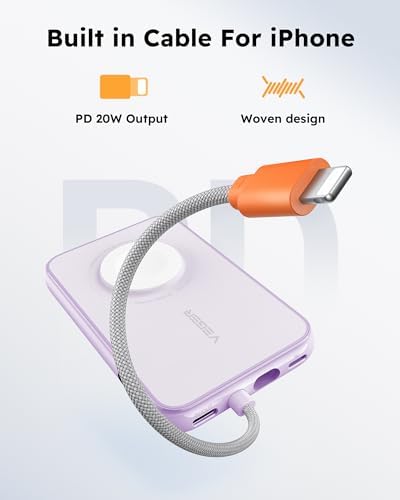 ✔️【Special Designed for Apple Family】: Built-in cable for iPhone, a magnetic module for Apple Watch, and a Type C port output for iPhone 15 series, the portable charger will power your iPhone, Apple Watch, and Airpods simultaneously. ✔️【PD 20W Fast Charging】: The built-in cable supports PD 20W fast charging, providing your iPhone with 60% juice in 30 minutes, 3 times faster than normal 5V 1A charger. ✔️【Compatibility】: This portable battery charger is widely compatible with iPhone 15/14/13/12/Pro Max series, Apple Watch 9/8/7/6/5/4/3/2/1/SE/Ultra, as well as other Type C Android devices or tablets. ✔️【5000mAh Battery with Slim Body】: With a slim size of 4*2.4*0.6 inches, the external battery is a perfect travel accessory. 5000mAh capacity is emergenced for daily used, providing 0.7 charges for iPhone15/14, 7 charges for Apple Watch Ultra, 0.52 Charges for iPad mini 6, 40 charges for Airpods, 0.65 charges for Samsung S23. ✔️【What You will Get】: A VEGER 5000mAh portable charger with built in cable, 1x user manual, 1x USB C cable, our worry-free 12 month guarantee and 7 Day/24H friendly customer service. If you have any problems, please contact us and we will solve it within 12 hours. ✔️【Friendly Reminder】When charging your Apple Watch, kindly press the button and wait 5-16 seconds for the wireless charging to activate.