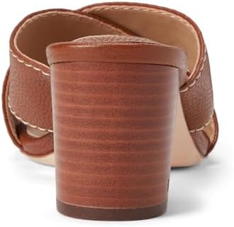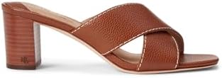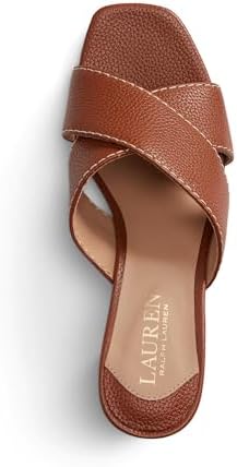 2.25" (60 mm) heel height. Open toe. Slip-on styling. Crisscross vamp. “LRL” metal logo at the heel. Buffed leather outsole. Stacked leather heel.