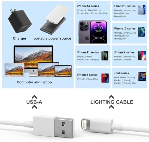 ♥【 Apple MFi Certified】:Each cable contains a unique, verified serial number and an authorization chip issued by Apple to ensure 100% compatibility with any Lightning device.Lightning Cord fully supports the iOS version and all future updates.Enjoy fast data transfer, syncing and charging,while also ensuring safety. ♥【Superior Durability and Strong Quality】High quality TPE material makes this cable more durable and stronger than ordinary iPhone charger cables, while remaining flexible and tangle-free. It is tested for up to 30,000+ bends, making it more durable. Withstand all kinds of daily connection needs and long-term use. ♥【Safe Fast Charging】:AZMOGDT iPhone charger cable are made of high purity copper core and smart intelligent chip with overcharge protection, stable current protection, automatic switching and battery protection. ♥【Wide Compatibility】: MFi certified for flawless compatibility with all Lightning devices, including iPhone, iPad, and more.Works With for iPhone14/13/13 Mini/13 Pro/12/12Pro/12 Pro Max/12 Mini/11/11 Pro/11 Pro Max/XS Max/XS/X/XR/8 Plus/8, iPad Pro/ iPad Air/ iPad, AirPods Pro. Standrad Charging Speed works with iPhone 7/7 Plus/6s/6s Plus/6/6 Plus/SE/5s. ☎【A Cable for Life】We’re so confident in our cables, we are offering a hassle-free replacement for all quality issues. Not for half a year, not for 18 months, but for an entire lifetime. It’s the only cable you will ever need to buy. Lightning Cable 5 PACK(3/3/6/6/10 )feet long, convenient to charge your device in bedroom, sofa, office, travelling, even if you are in the back seat of the car.