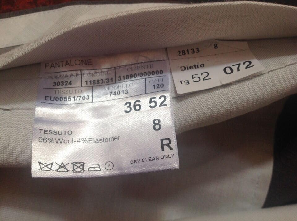 COLOR: GRAY Size: Euro 52; US 36 inch waist Inseam 36 inches Unhemmed Zip fly with hook-and-bar and button closure Slant pockets; back button-closure welt pockets Lined to knee 96% wool, 4% elastane Dry clean Made in Italy