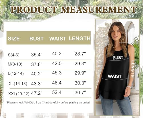 Design: Cutting inside out design, Raw edges on the back and hem add a touch of fashion style. Loose fit scoop neck tank tops with side slits, a front curved hem, and a plain back hem, offering a loose fit. Versatility: These sleeveless long tops pair perfectly with jeans, shorts, slacks, skirts, bike shorts, and leggings. They can be worn alone or layered under cardigans or coats for cooler weather. Occasions: Ideal for daily casual wear, sports, lounging at home, work, beach outings, vacations, creating outfit of the day (OOTD), gifting, running errands, and going out. Particularly suitable for tropical travels. Clothing Care: Machine or hand wash with cold water, and hang or line dry. Avoid using bleach. Note that due to long-distance transportation, the tanks may have some wrinkles, but they will look great after ironing. Size Guidance: Please refer to the WIHOLL Size Chart before ordering. If you have any other questions, feel free to contact us anytime.