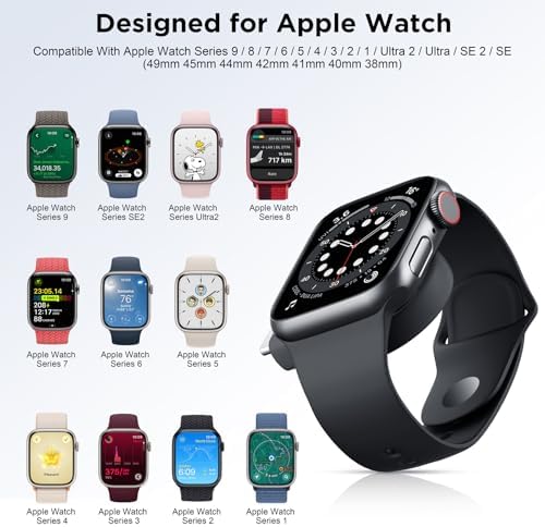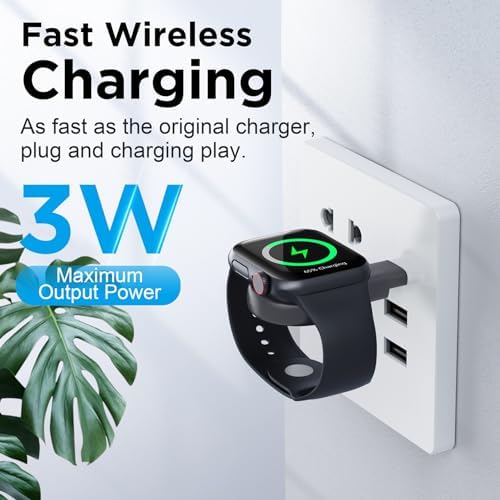 【Widely Compatibility】This upgraded charger designed for Apple Watch (model: Ultra2 Ultra SE2 SE Series 9 8 7 6 5 4 3 2 1, sizes: 49mm 45mm 44mm 42mm 41mm 40mm 38mm) , ensuring convenient charging for all Apple Watch users (ATTENTION: This battery charger is NOT a power bank). 【Two-Way Type Universal】Built-in USB-C interface and equipped with USB-A adapter dual-port design, suitable for almost all types of power ports in daily life, you can plug the charger into power bank/laptop/wall adapter/car or other devices with USB-A or USB-C charging ports to charge the watch. 【Cable-Free & Portable】No more messy cables, saving you from the hassle of winding cables! The compact & lightweight design is slip into pocket or bag easily and convenient to carry around. Perfect ideal for using at home, office, business trips, camping, travels and more daily use scenarios. 【Powerful Magnetic Adsorption】The watch can be adsorption when it touches the charger. The strong magnetism ensures the watch stays in the center of the charger and secures the watch from sliding off, provide a stable charging environment for your Apple Watch. 【Fast & Safe Charging】This portable charger for Apple Watch offers high speed battery charging experience just like original charger, which can fully charged your watch only takes 2~3 hours. And the safety features such as over-current, over-voltage, short-circuit and over-temperature protection protect your iWatch from damage caused by abnormal charging.