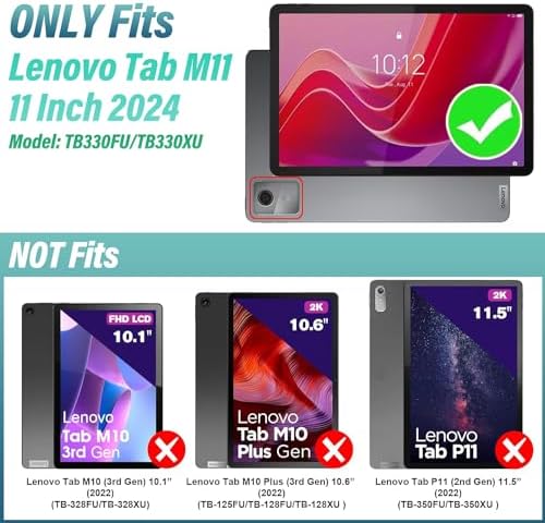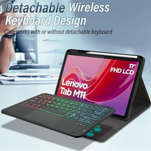 ⌨【Compatibility Model】Wireless Keyboard Case Designed Exclusively for 11" Lenovo Tab M11 1st Gen (Model: TB330FU / TB330XU) 2024 Tablet PC ONLY. Not compatible with any other devices. Please kindly check the model number before purchase ⌨ 【3-Zone 7 Color Backlit】Backlit Detachable Keyboard makes your keyboard gorgeous and special, typing fun and easy in the dark/night. Built-in long life Lithium-ion battery and high quality waterproof keyboard conductive film, Adjustable backlight allows you to personalize your setup, match specific working conditions and showcase your favorite colors. Make it easier to find your keys in the dark. ⌨ 【Precise Cutouts & Multi Angles】Precise cutouts allow full access to all features and offer the perfect protection, convenience for daily use. Free to adjust the best viewing position by remove keyboard and adjust the screen. Perfect for watching, reading, working or playing games. ⌨【Multi-Touch Trackpad】Our integrated multi-touch trackpad perfectly adapts to Android system, with plentiful trackpad gestures, delivering a comfortable user experience while allowing you to click, scroll, and swipe through content effortlessly. ⌨【Well-Protect Keyboard Case】Made of premium TPU leather. The well-madecase gives you a comfortable touch feeling. Premium composition leather exterior provides full protection for your tablet, greatly reduces the damage to your tablet caused by collisions, Soft anti-slip interior protects your tablet from being scratched.